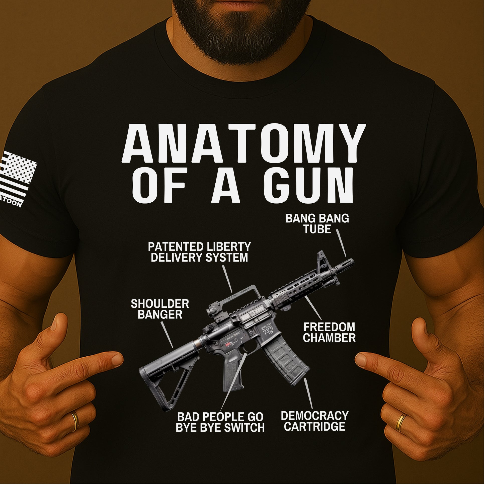 This is what peak firearm education looks like. Our "Anatomy of a Gun" tee is a hilarious breakdown of your favorite boomstick, labeled for full tactical accuracy: