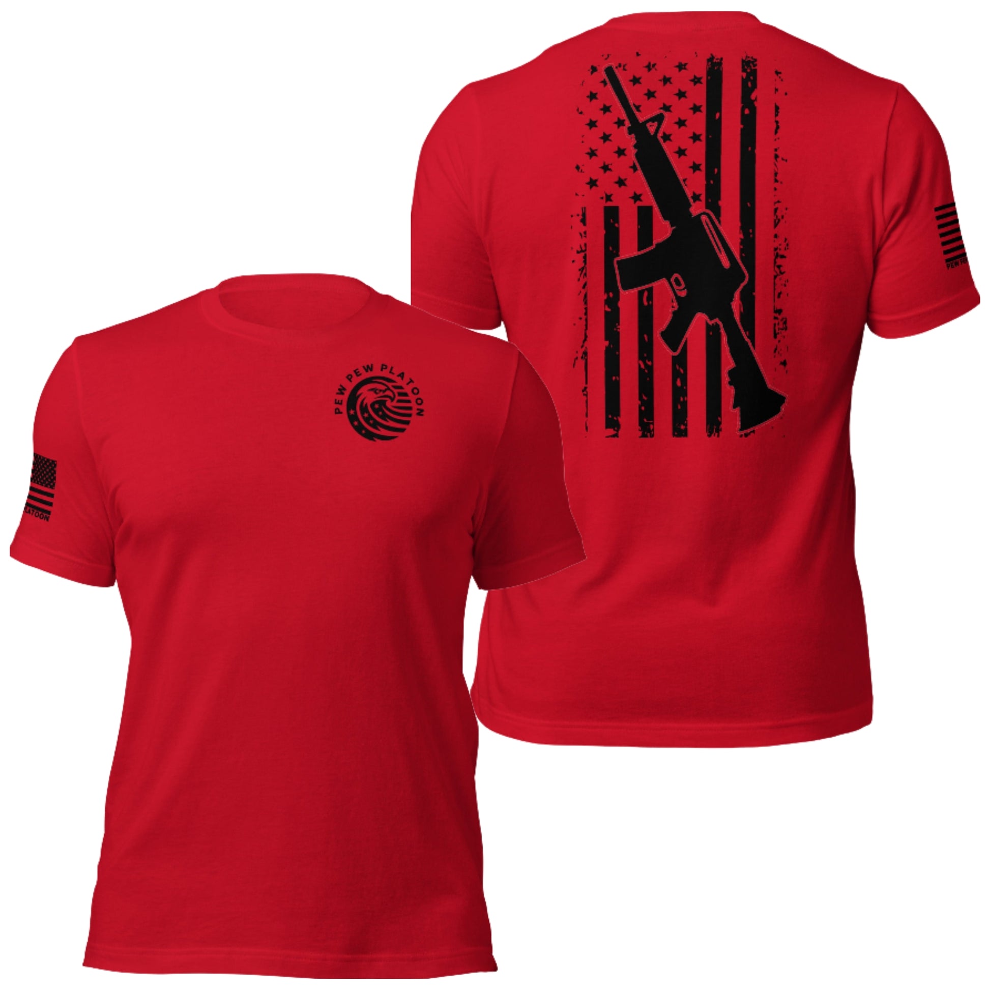 This shirt is for those who believe in freedom, firepower, and the flag. Featuring a bold rifle silhouette over a distressed American flag, this design is all about standing strong and protecting what matters.