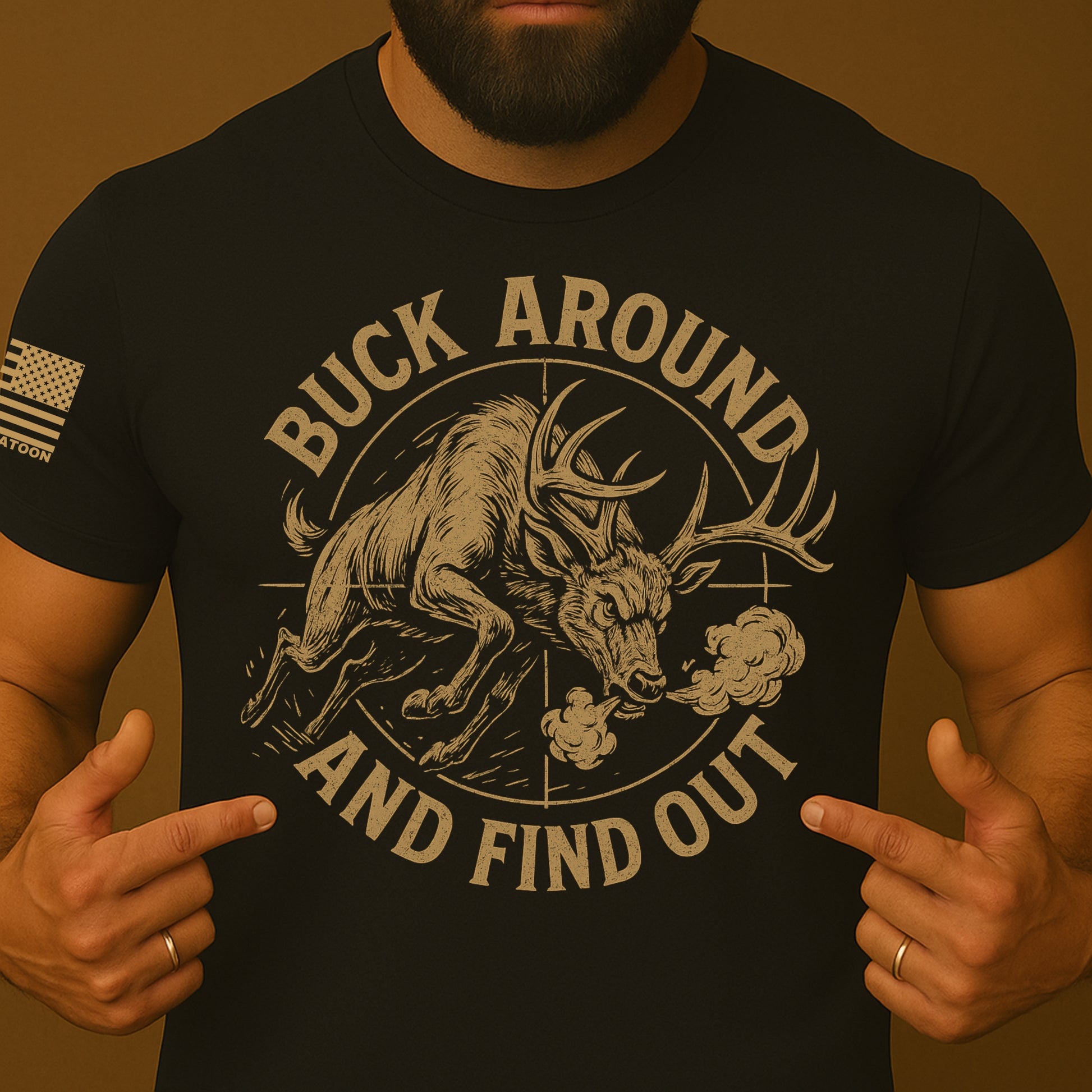 If you're the kind of guy who handles problems like a freight train handles squirrels, this shirt’s got your name written all over it. Featuring a charging buck in a crosshair with smoke and fury, this tee delivers a message loud and clear—don’t mess with a hunter who's had enough.