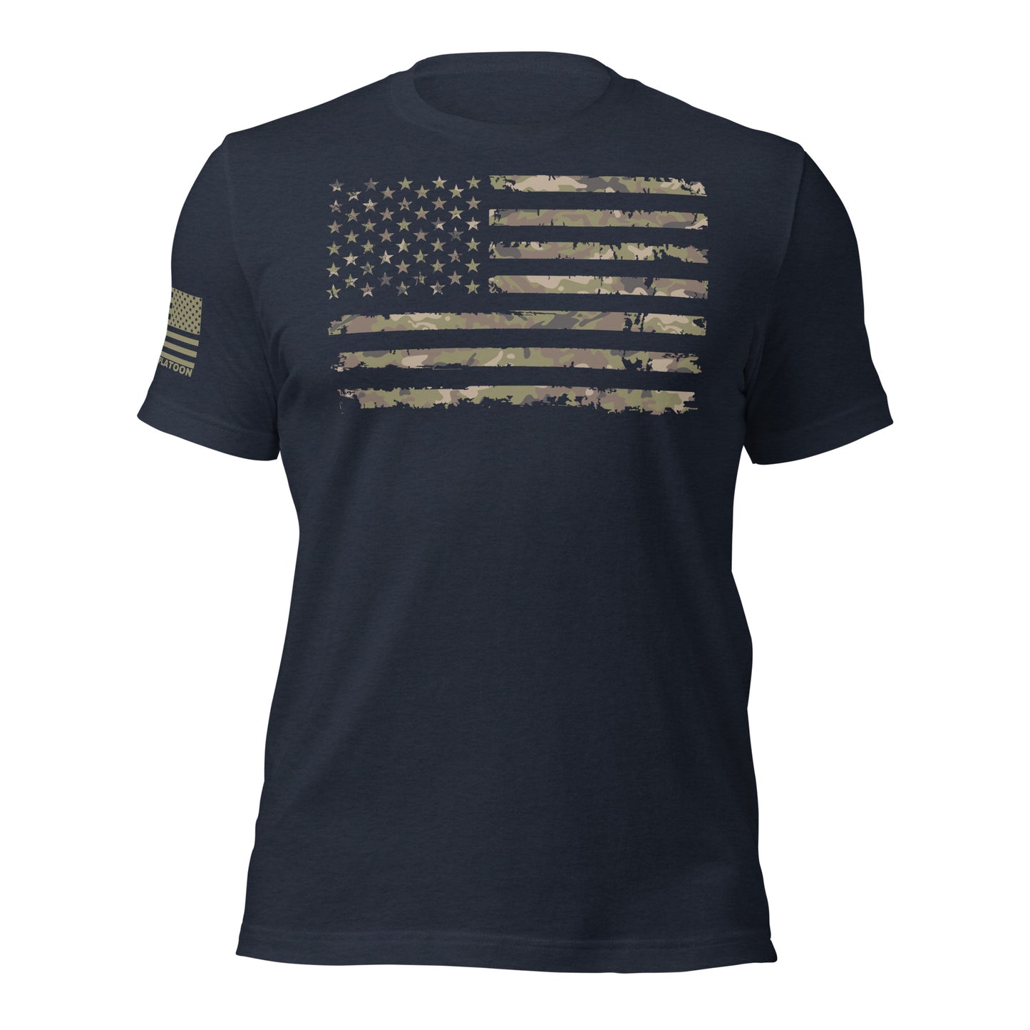 Patriotism meets tactical style. This rugged tee features a distressed American flag design with a bold camouflage fill—perfect for those who bleed red, white, and multicam.
