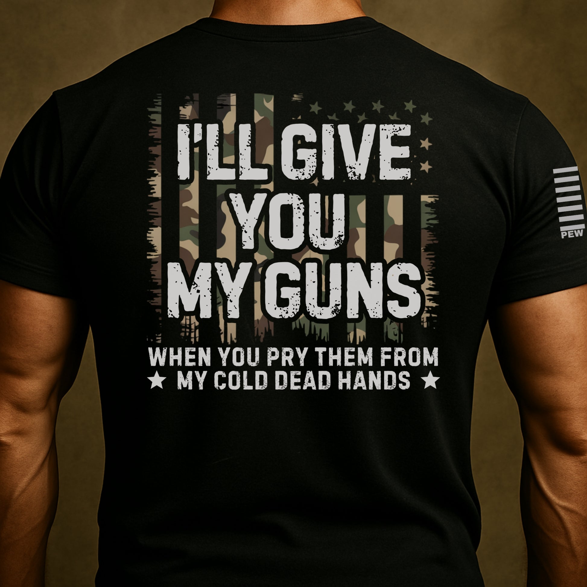 This shirt says what every red-blooded American is thinking. Featuring a rugged American flag background and the bold message, “I’ll Give You My Guns – When You Pry Them From My Cold Dead Hands,” this tee is for patriots who mean what they say and back it with firepower.