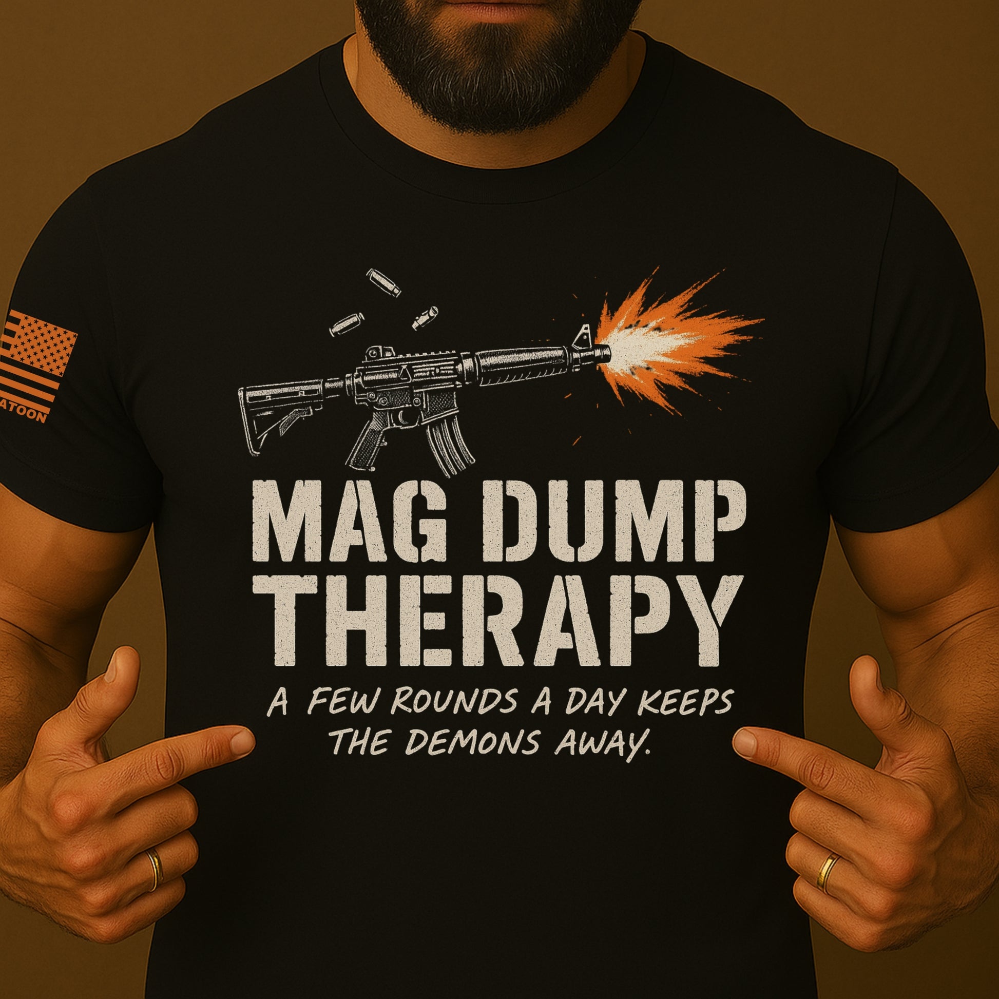 Screw the couch and the co-pay. Nothing clears the mind like emptying a mag at the range. Our “Mag Dump Therapy” tee is for the vets, patriots, and everyday warriors who know a few rounds a day keeps the demons away.