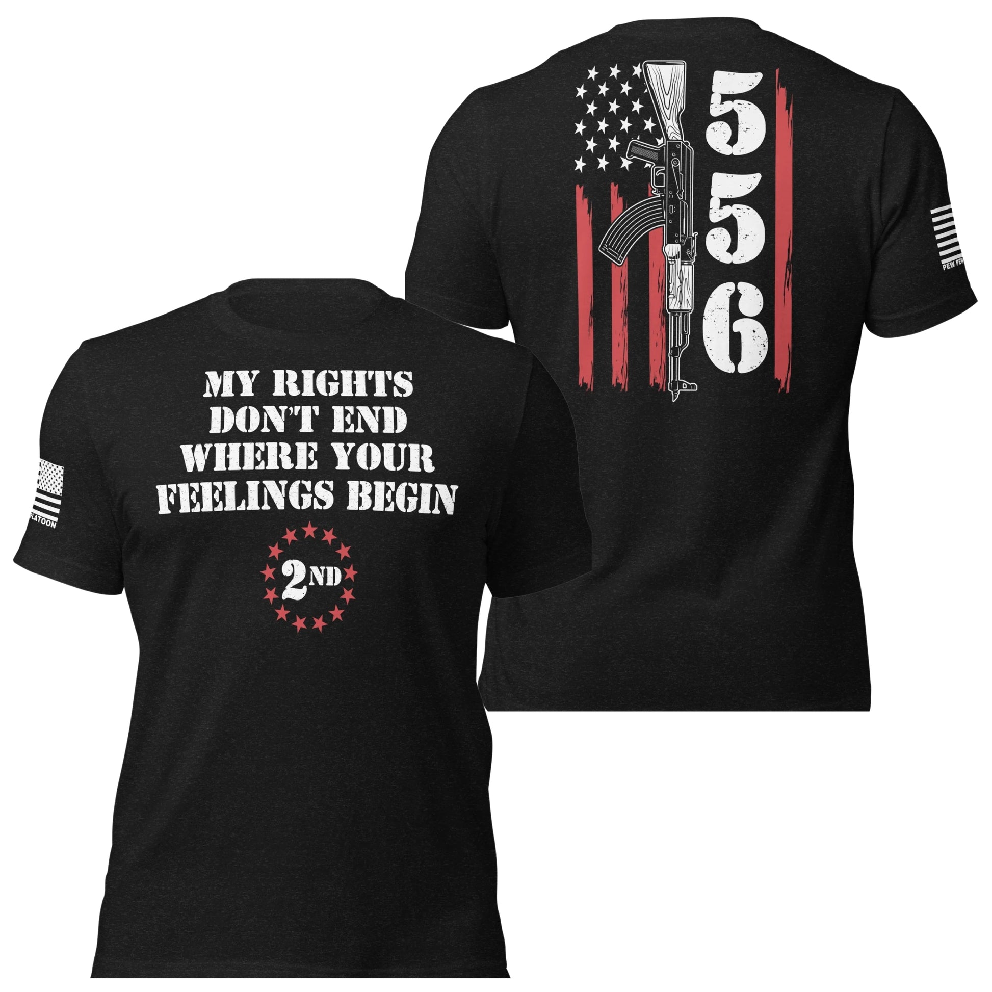 For the unapologetic 2A supporter, this tee makes one thing clear: your rights aren’t up for debate. Featuring a bold back print with a rifle, distressed American flag, and the legendary "5.56" – a nod to the caliber that keeps freedom secured. The front drives it home with "MY RIGHTS DON’T END WHERE YOUR FEELINGS BEGIN", because facts don’t care about feelings.